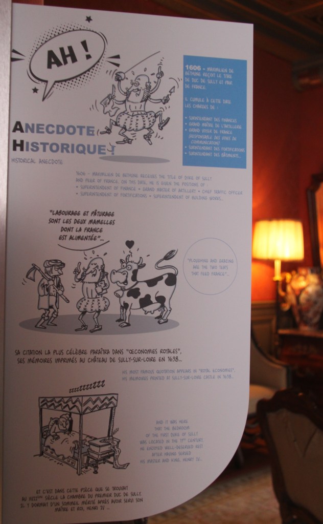 La visite du château de Sully m’émerveille : pratiquement le seul édifice de la ville qui soit resté debout à travers les bombardements de la deuxième guerre, propriété du département du Loiret, il est formidablement rénové et passionnément guidé et commenté par un guide-conférencier. Moi qui suis, c’est un euphémisme, généralement assez critique envers les guides, là, j’ai été bluffée. C’est peu dire que je vous recommande cette visite -si vous vous intéressez à l’histoire de France, évidemment.
